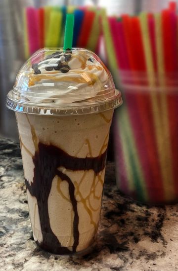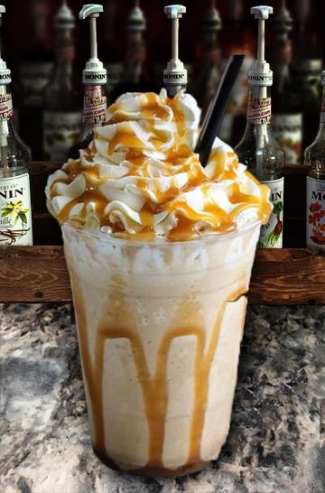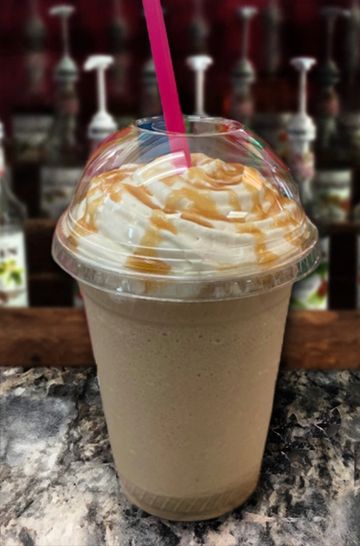 A level above a caramel frappe. This cold drink can be made blended, over ice or without espresso. Made with espresso, ice cream base, caramel sauce and topped with whipped cream and drizzled with more caramel.