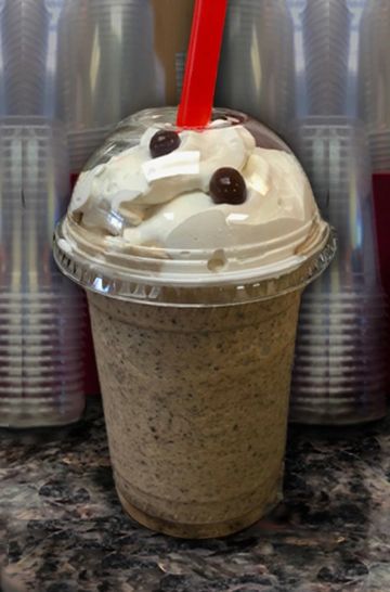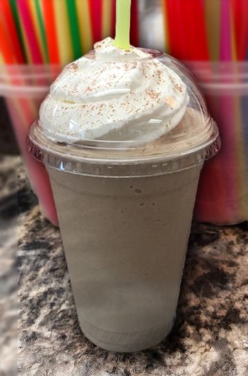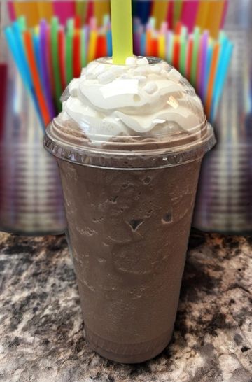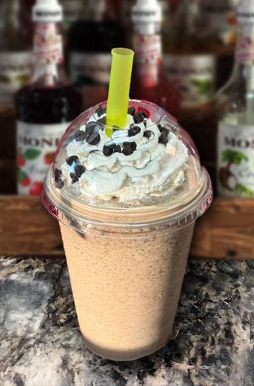 Our signature Frappe blended with Dark Chocolate Sauce and Chocolate Covered Coffee Beans. Finished with Whipped Cream and more Chocolate Covered Coffee Beans on top.