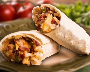 A delicious flour tortilla filled with egg, sausage or bacon, potato, cheese and green chili.
