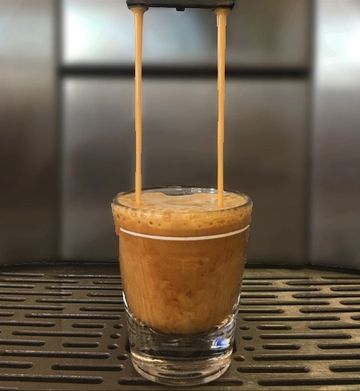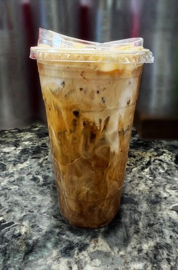 Espresso shaken till it achieves a velvety texture and poured over ice. May add cream, flavor or sweetener.