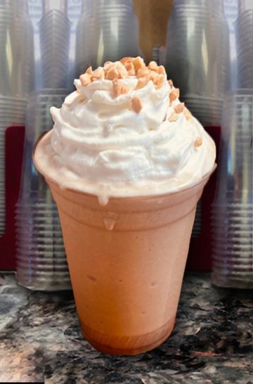 A frappe style drink made with White Chocolate, Salted Caramel, Real Peanut Butter, Chopped Peanuts.